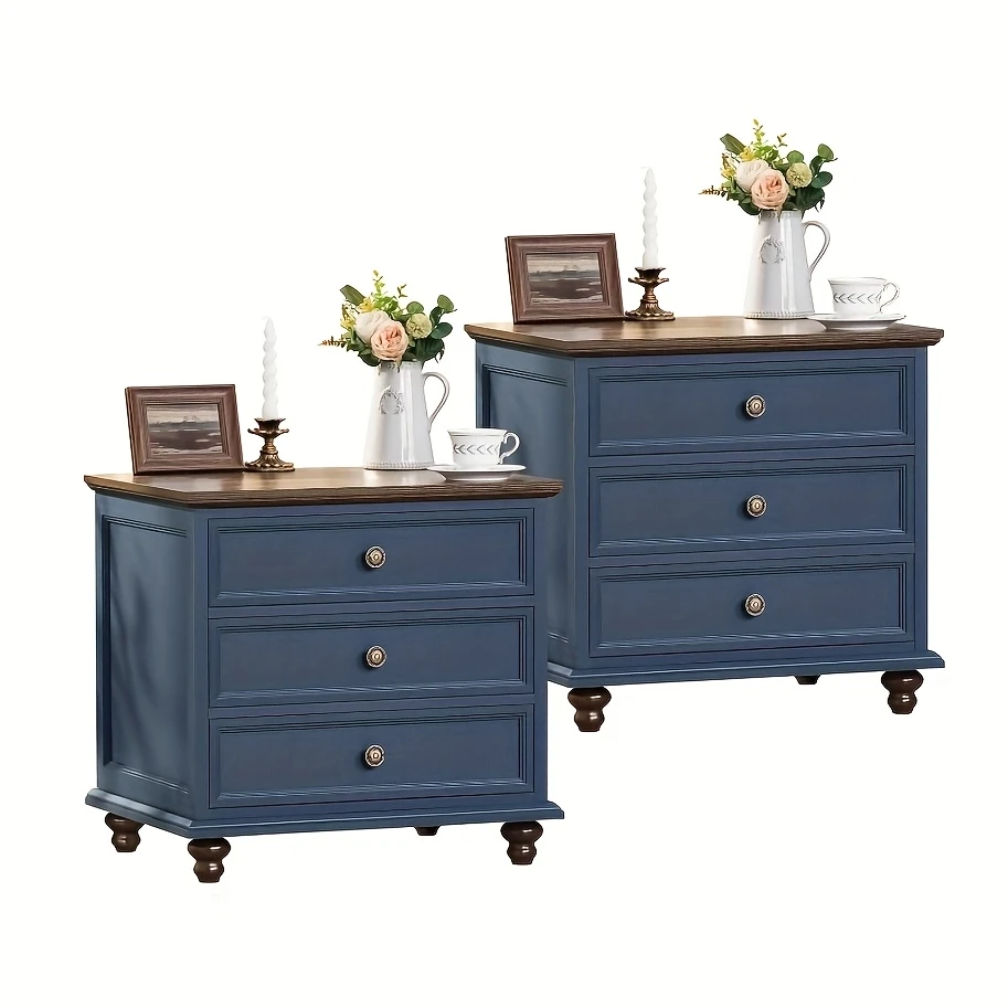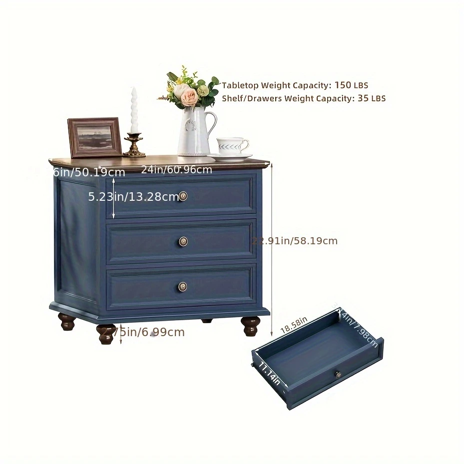 24" Wide Farmhouse Night Stand, Large End Table With 3 Drawers & Metal Handle, Navy Blue Dresser For Bedroom, Wood Bed Side Table Chest Of Drawers, Nightstand Cabinet For Living Room, Closet
