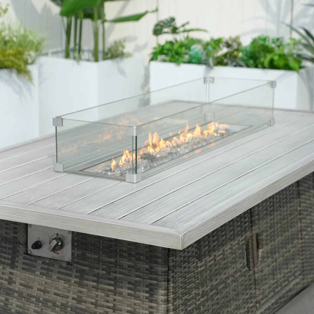 • 🔥 Fire Pit: Includes stainless steel fire-pit cover, crushed glass, and a glass enclosure